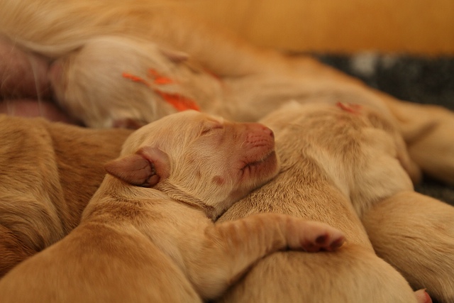 In den Abendstunden des 17. April ist unser G Wurf zur Welt gekommen. Die Geburt war für Limit sehr anstrengend, zeichnete sich doch am Samstag im Verlaufe des Tages ab, das sie nicht bis zum errechneten Termin warten würde. Die erste Hündin wurde leider tot geboren und wir waren hier alle sehr traurig, besonders Limit, die es nicht verstand warum wir ihr ihn nicht überlassen haben. Der erste Welpe hat es immer am schwierigsten, macht er doch den Geburtstskanal frei für seine Geschwisterchen, die dann auch nach einander das Licht der Welt erblickten.